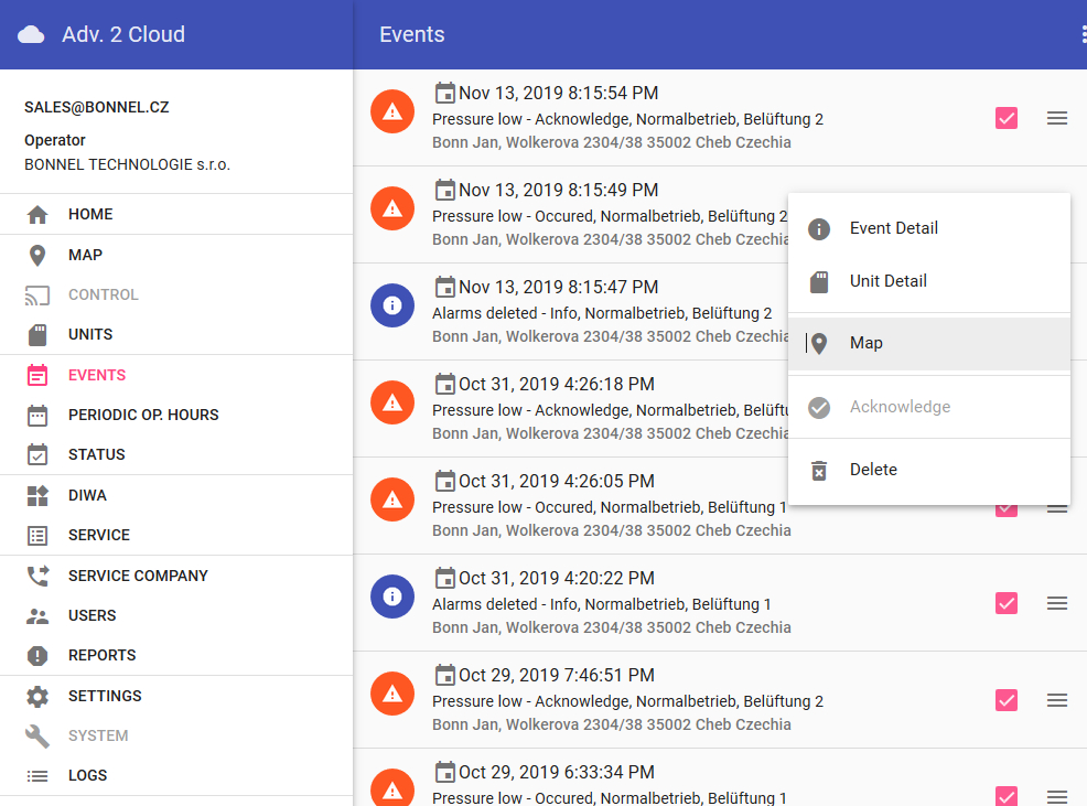 All data will be stored in SQL databases on a server. This can be either your server, a BONNEL server or cloud servers. Stored data contains alarms and events, as well as all plant data (e.g. address, GPS coordinates), customer contact data and service company data.